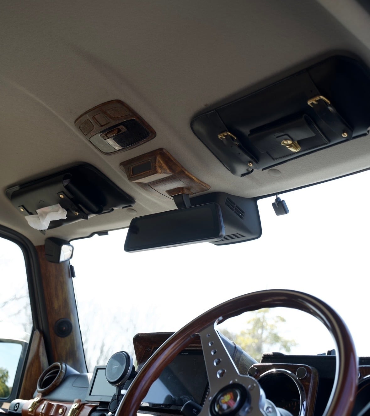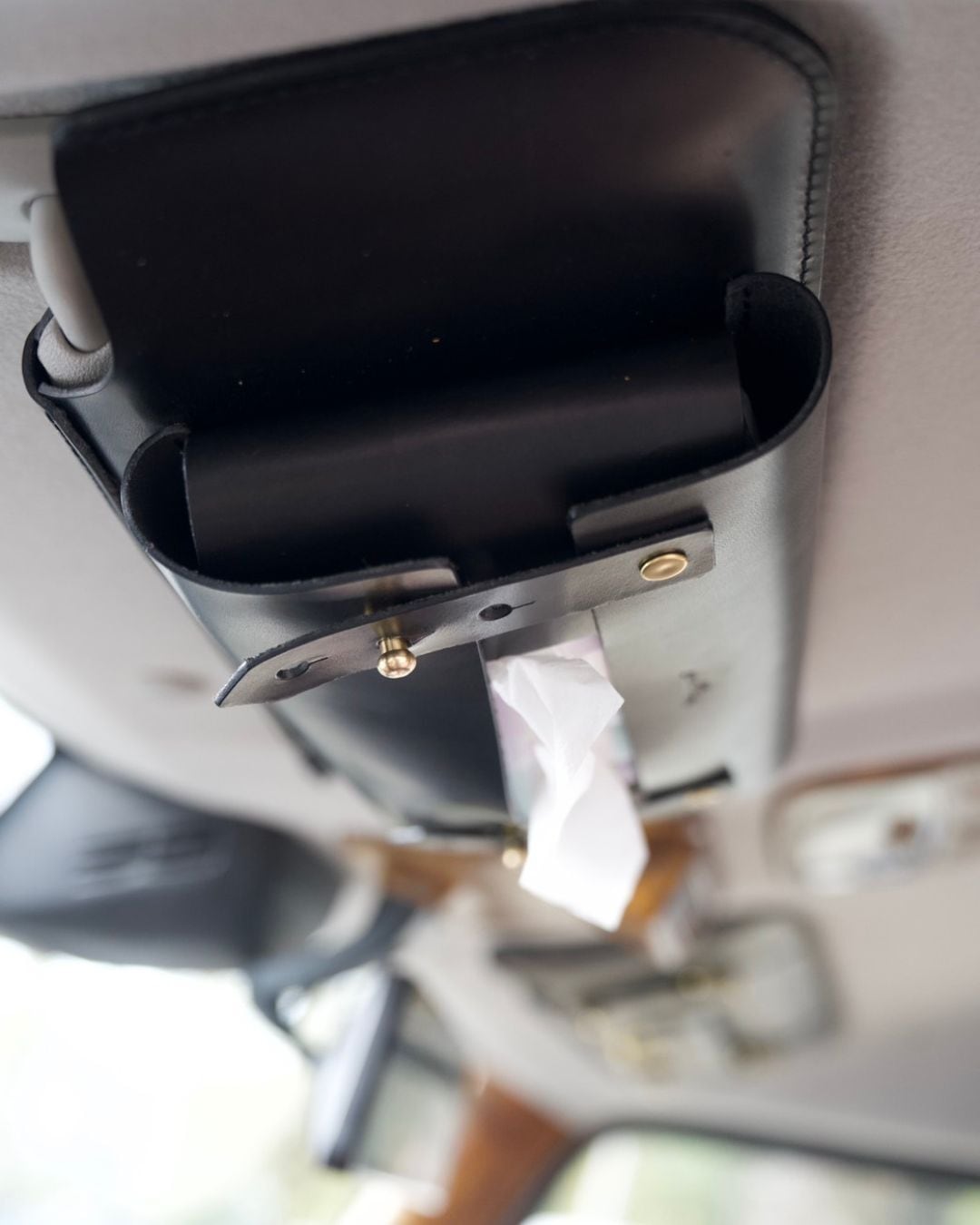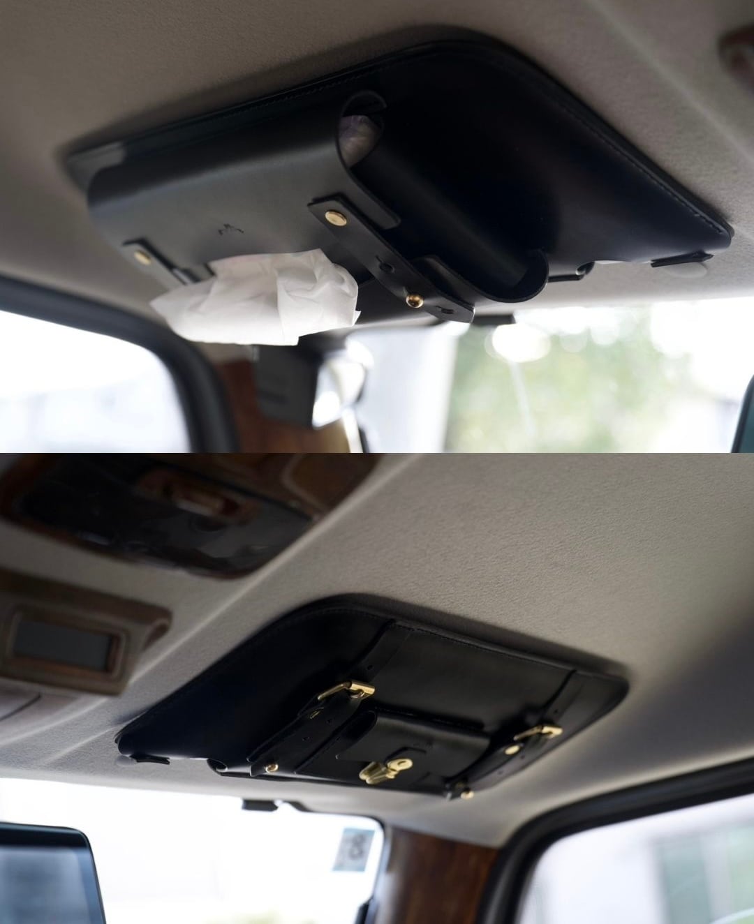 助手席: 生活感の出がちなティッシュ箱を、おしゃれに天井へ収納。